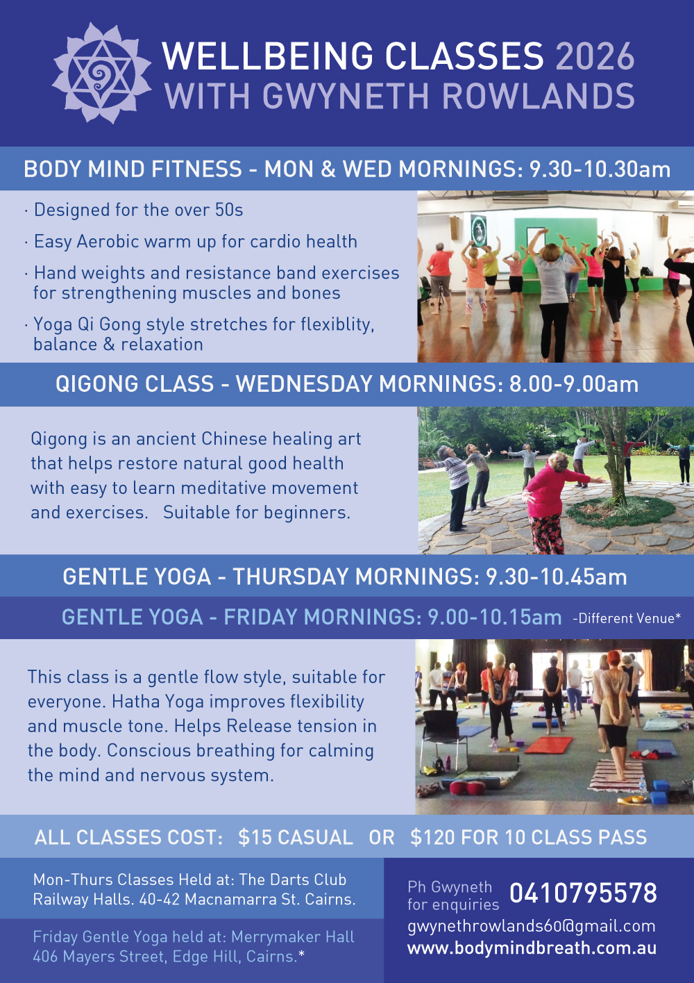 Gwyneth Rowlands was the Founder and Principal teacher of the Body Mind Breath Centre in Cairns for over 13 years, she now teaches at various venues within the community of Cairns.